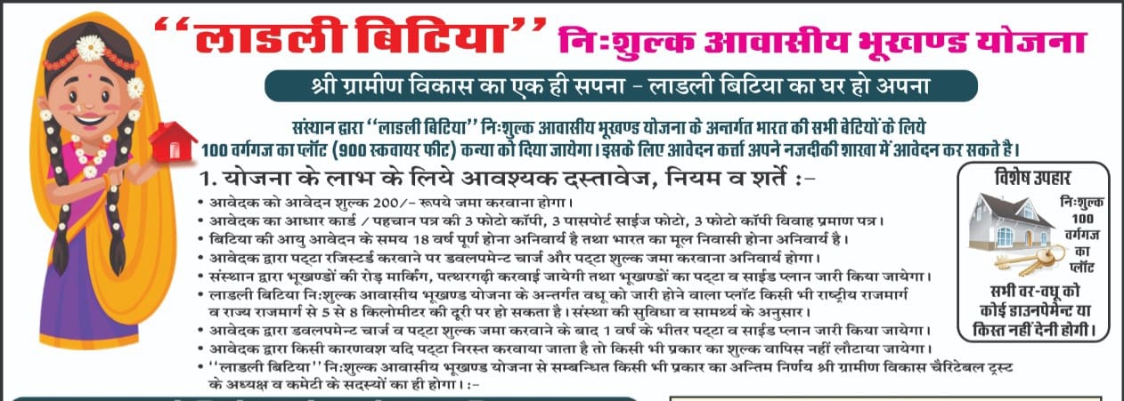 “लाड़ली बिटिया” नि:शुल्क आवासीय भूखंड योजना — मायका — श्री ग्रामीण विकास चैरिटेबल ट्रस्ट की एक विशेष और मानवीय पहल है, जिसका उद्देश्य हर बेटी को सम्मान, सुरक्षा और भविष्य का आधार देना है। हमारा विश्वास है कि बेटी को केवल विवाह तक सीमित नहीं किया जाना चाहिए, बल्कि उसे जीवनभर के लिए एक सुरक्षित ठिकाना और आत्मसम्मान भी मिलना चाहिए।